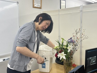 ブログ担当花子です。 きれいにお花を活けている龍輝先生 お陰で学園はいつも華やかです その後に電…