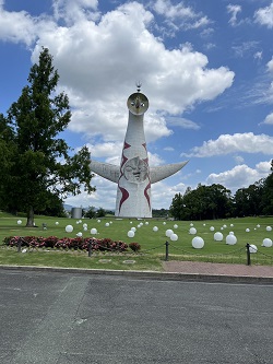 ブログ担当花子です。 少し遠くに見えるあの塔は… 久しぶりの太陽の塔 雲の多い日でしたが 歓迎するかのように青…