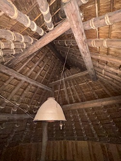 ブログ担当花子です。 竪穴式の宿泊施設は 中から見るとこんな天井 いい感じの囲炉裏がありますよ~ 30分3万円…